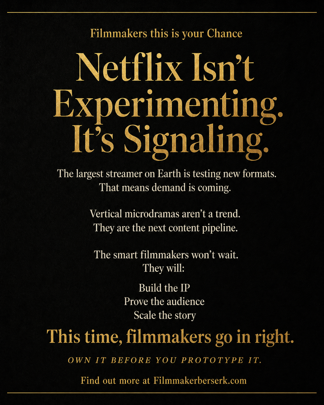 Netflix just confirmed Vertical Video Microdrama is now a $20-billion industry. And independent filmmakers — the people this shift could most benefit — are about to get steamrolled by it if you don't start building now.. But you CANNOT dominate if you don't own your IP. Find out about IP Prototyping in the Vertical Microdrama streaming space. The audience is signaling what they want to watch and how. Berserker Film Business Mastery is the Prerequisite required to get there.